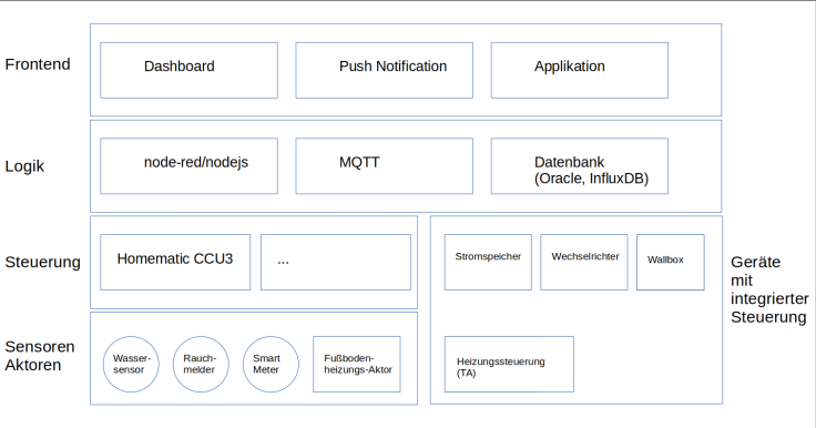 Auf der untersten Ebene kommen Sensoren (z.B. Rauchmelder) bzw. Aktoren (z.B. Fußbodenheizungsaktor) zum Einsatz. Da ich kein Bastler bin, sind das Komponenten, die ich von bestimmten Herstellern kaufe. Diese Komponenten kommunizieren mit Steuereinheiten (z.B. CCU3 von Homematic), die ich ebenfalls vom Hersteller beziehe, um mir den Aufwand der Integration an dieser Stelle zu sparen.